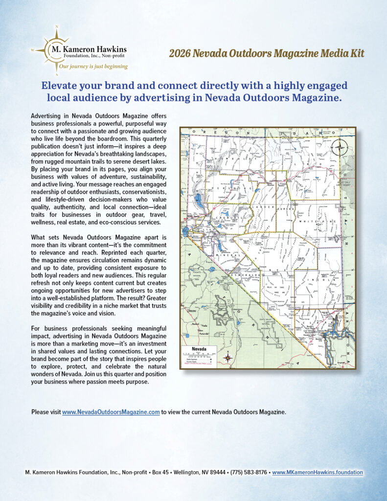 For business owners and visionaries, advertising in this premier edition is an opportunity to elevate your brand to new heights. By aligning your business with the breathtaking vistas and high-quality storytelling of Nevada Outdoors, you aren’t just buying space on a page—you are capturing the hearts of a community that values authenticity and exploration. This is your stage to showcase your commitment to the Nevada lifestyle, reaching an audience that is as passionate about quality as they are about the great outdoors.
